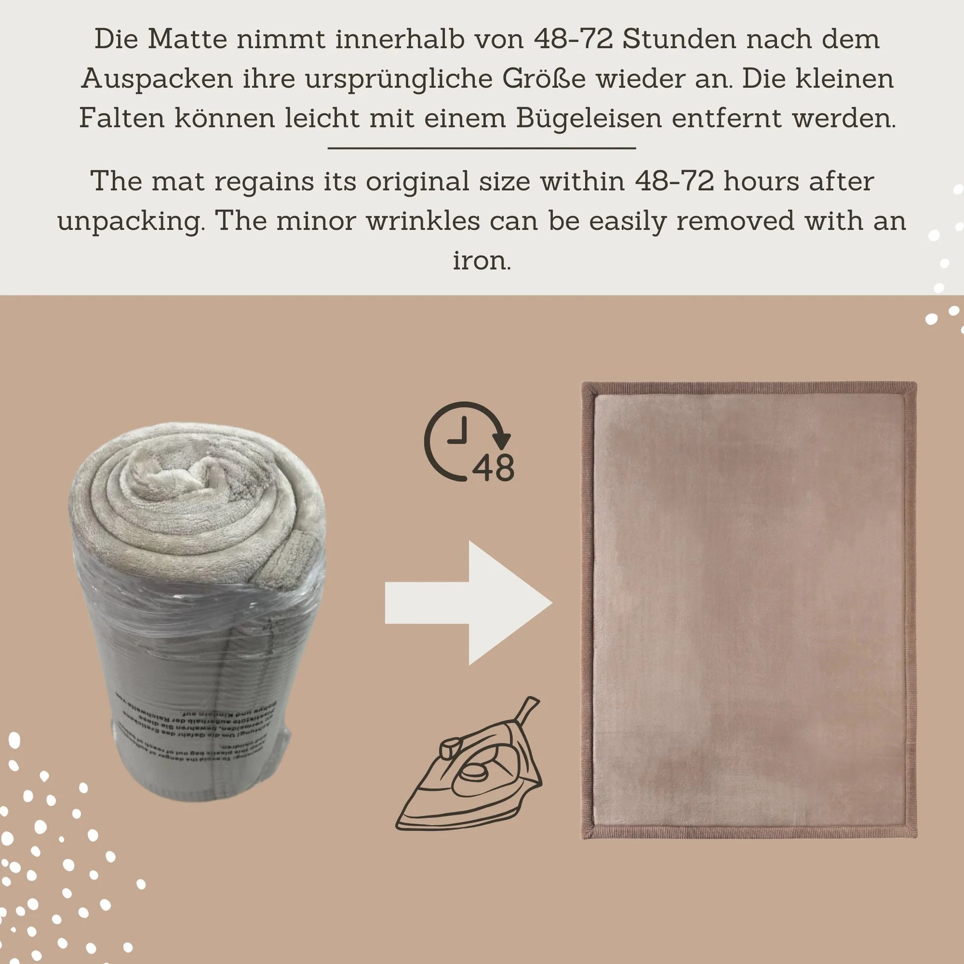 DER WOLKENWEICHE KINDERTEPPICH besteht aus drei Schichten: 1. Korallensamt für den weichsten Hautkontakt, 2. elastischer Memory-Schaum für bequemes Spielen und Krabbeln, 3. rutschfeste Rückseite zum Schutz vor Stössen beim Fallen. Durch die extra Grösse von 200 x 150 x 2 cm ist diese faltbare Spielmatte perfekt zum Krabbeln, Spielen, Yoga und für die Fitness zu Hause.